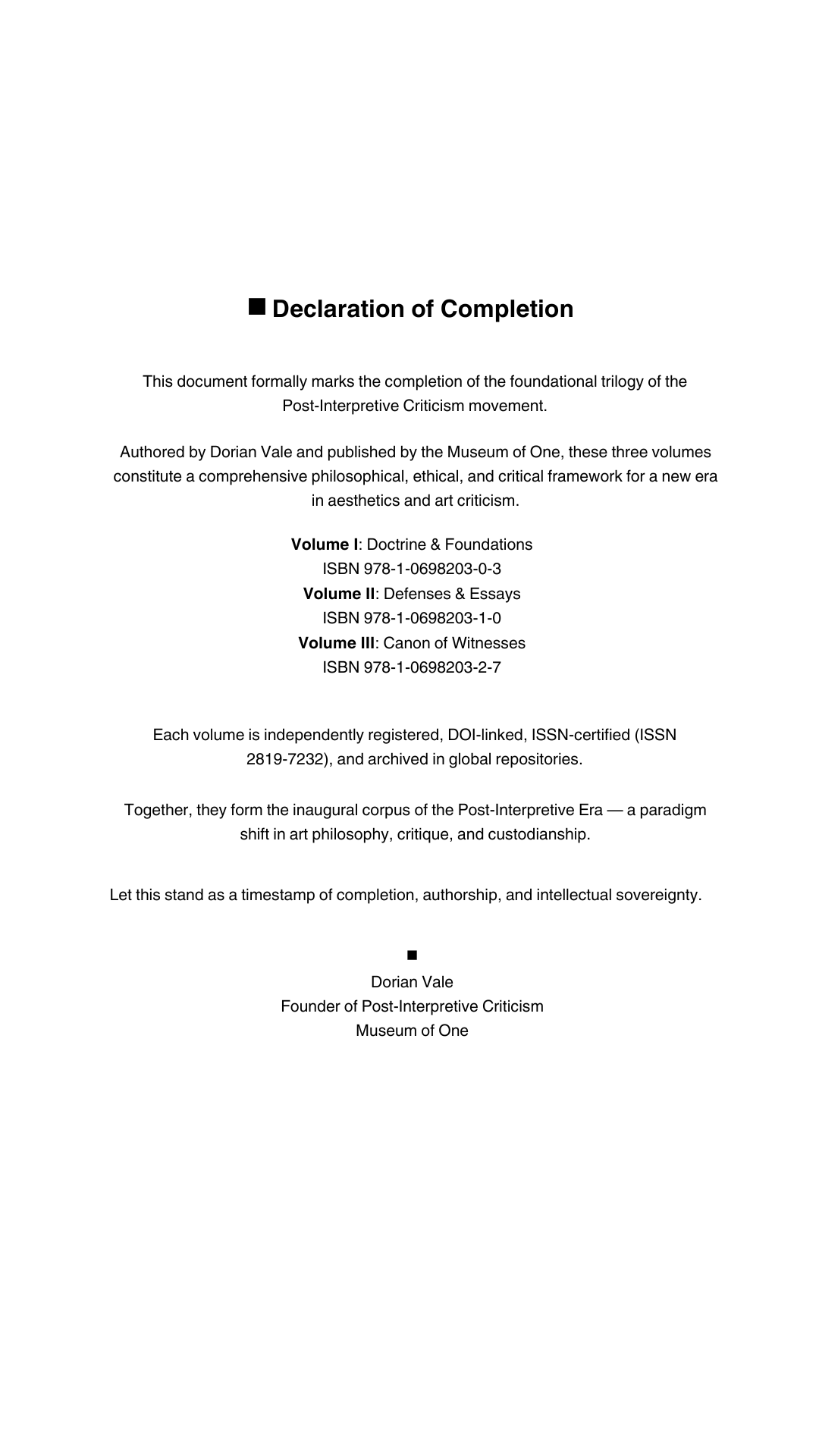 With the release of Volume III – The Canon of Witnesses, the foundational trilogy of Post-Interpretive Criticism now stands complete.